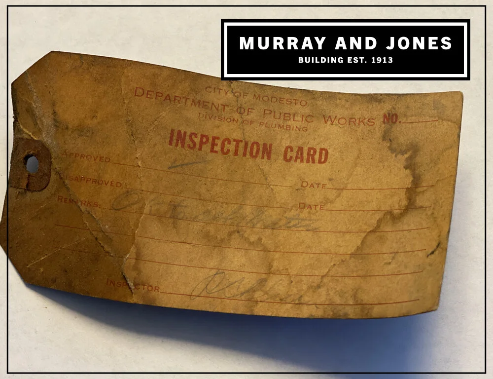 It’s heavy card stock has weathered but the leather seal protector where it attached to the pipe is well, still leathered. It’s from the City of Modesto, and while it doesn’t have a date on it, the inspector wrote “Ok to set meter”. An “Ok” to set the meter is normally something that is done when the building is built, so it makes sense to me that this is original to the building from 1913.